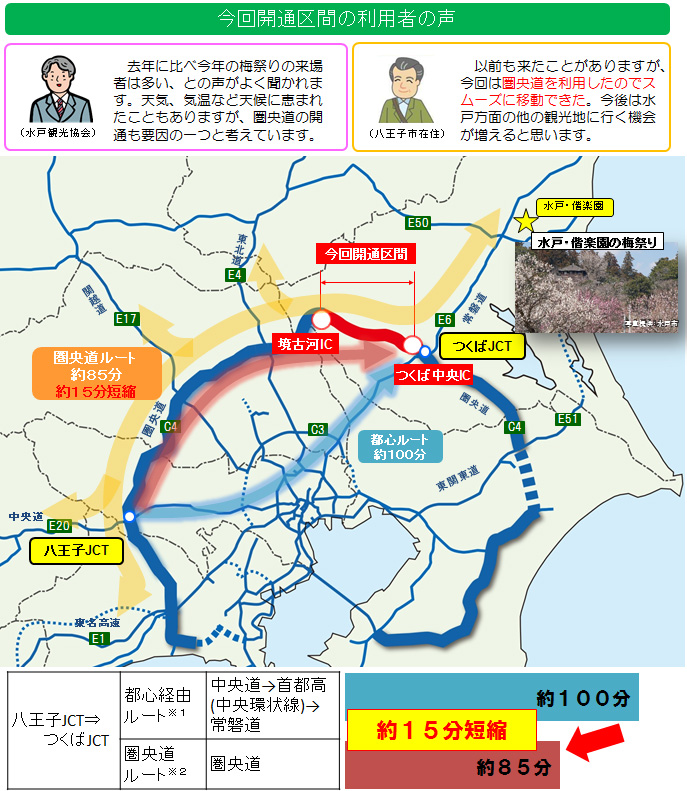 • 水戸・偕楽園の梅祭りの来場者からは、圏央道を利用したところ、所要時間の短縮を実感したとの声。