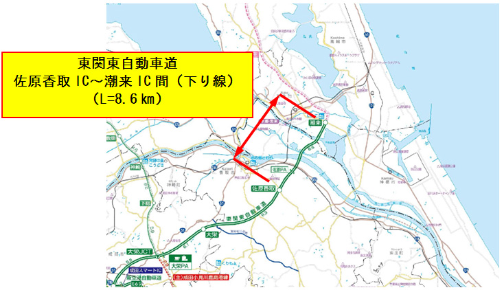 (1)区間 東関東自動車道 佐原香取IC~潮来IC間の下り線 (延長8.6km)