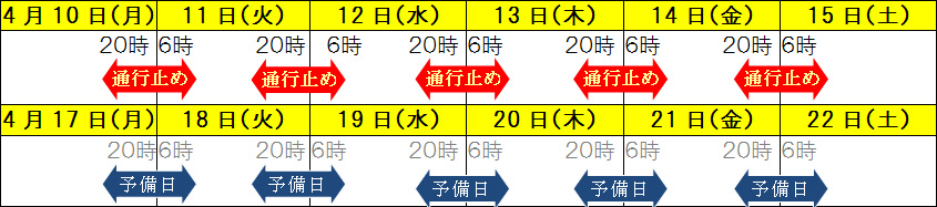 4月10日(月)~14日(金) 各日夜20時から翌朝6時まで