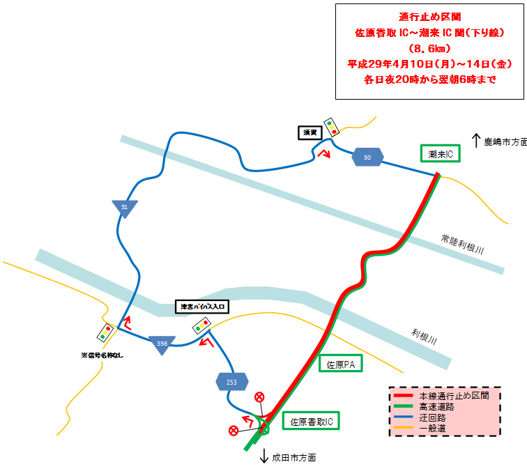 ~舗装補修工事のため、佐原香取IC~潮来IC下り線は通行できません~