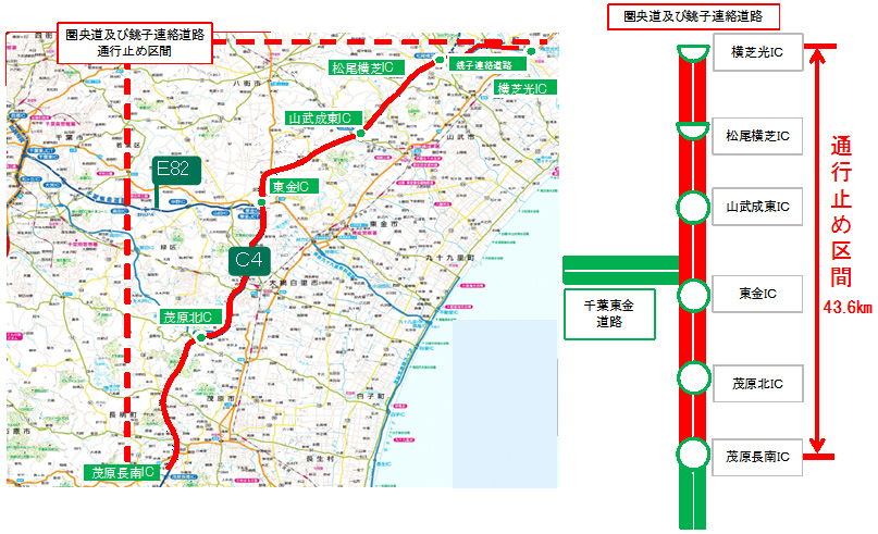 また、圏央道と連結する銚子連絡道路 松尾横芝IC~横芝光IC間(千葉県道路公社管理)についても、横芝光ICから流入にしたお客さまが松尾横芝ICから一般道に出られないため、通行止め(流入禁止)となります。