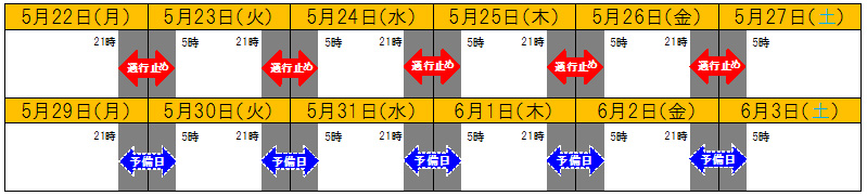 5月22日(月)から5月26日(金)の5夜間 各日夜21時から翌朝5時まで