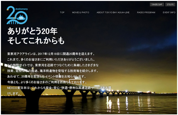 当社オフィシャルサイト「ドラぷら」内に、「アクアライン20周年記念サイト」を開設しました。東京湾を道路でつなぐために集結したさまざまな技術、海底トンネルの掘進や橋梁の洋上での架設など建設工事の経過、海洋構造物を管理する技術等を紹介します。合わせて、20周年を記念した各種キャンペーン、イベント等に関する情報を随時お知らせします。