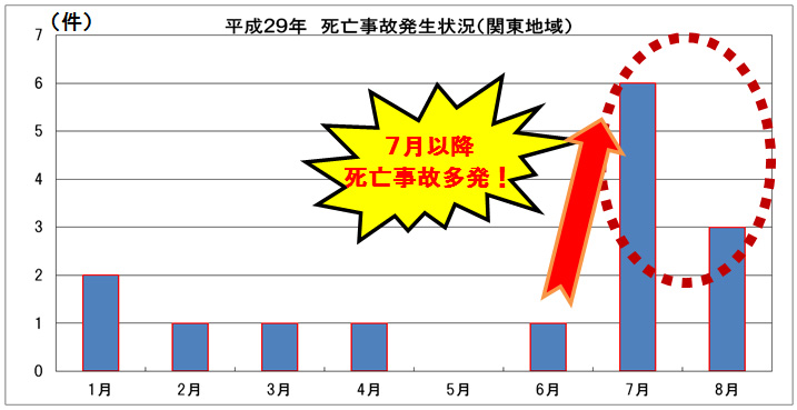平成29年の関東支社管内の死亡事故の発生状況は、8月末時点で15件※となり、すでに昨年の14件を上回っています。特に、7月・8月の二か月で9件※(今年の6割)発生しており、死亡事故が急増している状況です。(※8月31日時点・NEXCO東日本関東支社調べ)