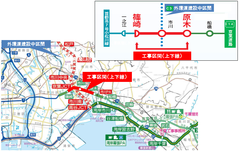 E14京葉道路 篠崎インターチェンジ(以下「IC」)~原木IC間におきまして、現在建設中のC3東京外環自動車道接続のための工事を実施します。
