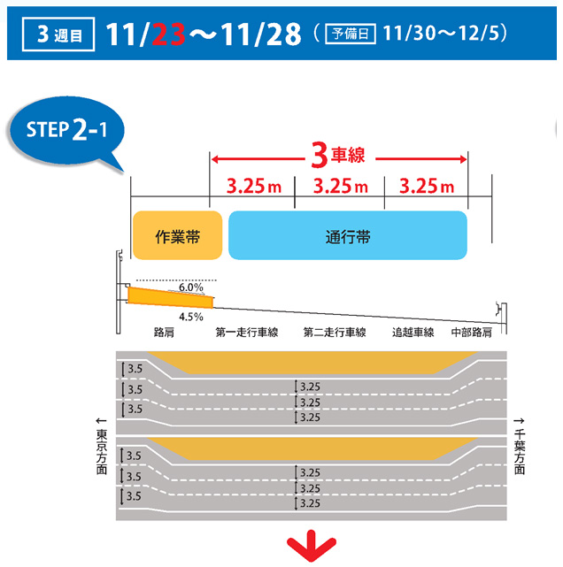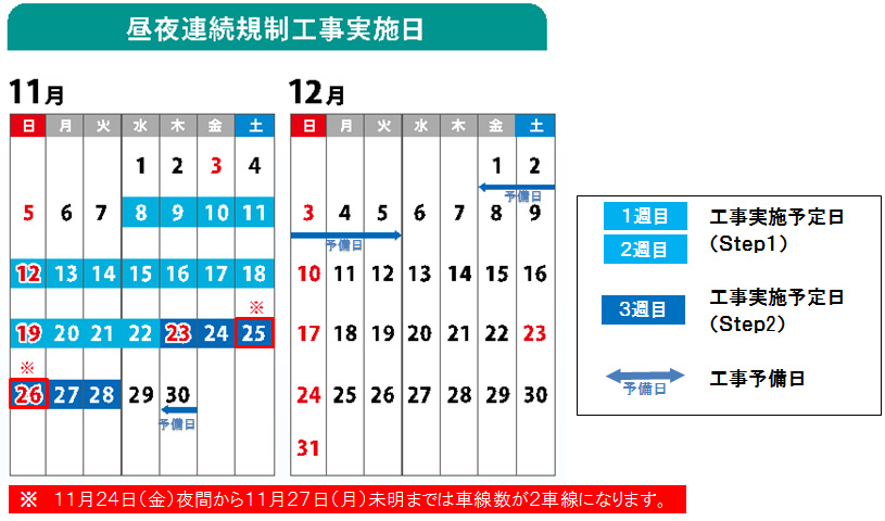 (上記期間のうち、11月24日(金)夜間から11月27日(月)未明までは車線数が2車線になります)