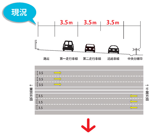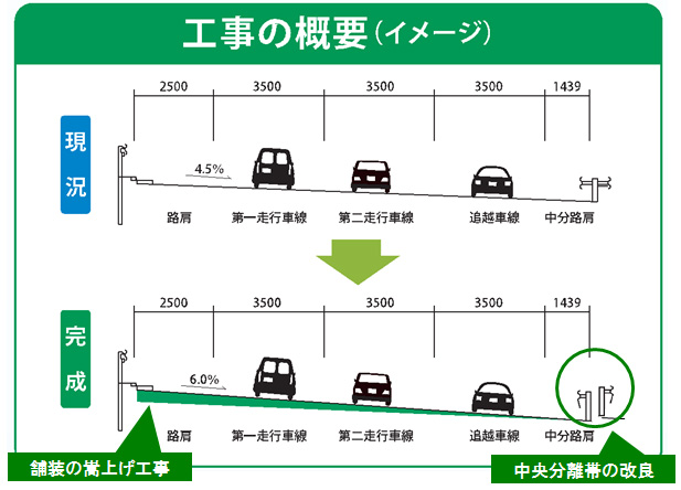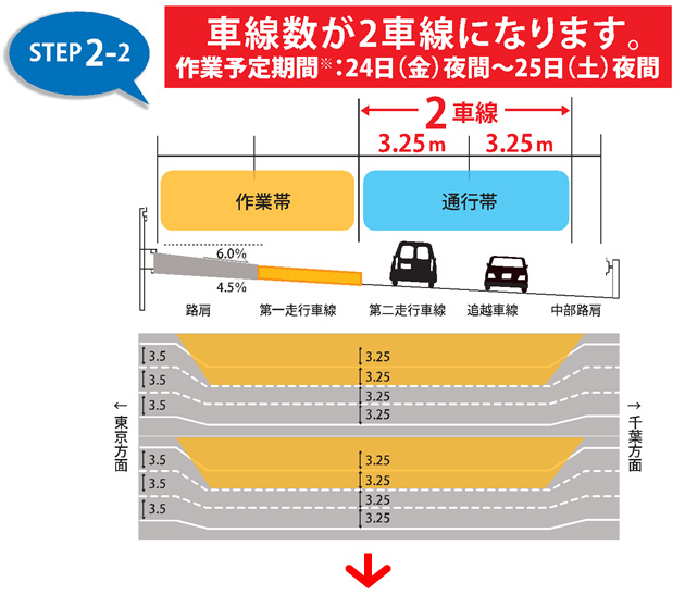 京葉道路の中央分離帯の改良工事や舗装の嵩上げ(下記イメージ)工事を昼夜連続で実施します。