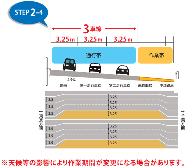 この工事では、京葉道路の線形を緩和するための舗装工事や中央分離帯の改良工事を昼夜連続規制のうえ実施します。