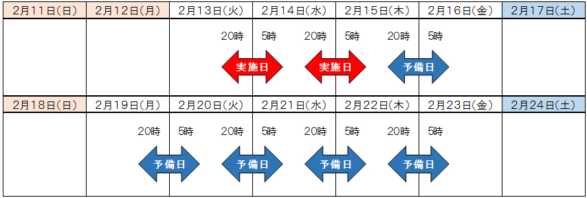 予備日: 平成30年2月15日(木)、19日(月)~22日(木) 各日夜20時~翌朝5時