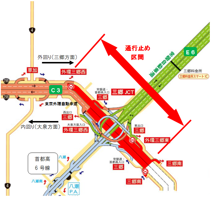C3東京外環自動車道(以下「外環道」)三郷南インターチェンジ(以下「IC」)~三郷ジャンクション(以下「JCT」)間の内回り、外環三郷西IC~三郷南IC間の外回りにおいて、工事に伴う夜間通行止めを行います。