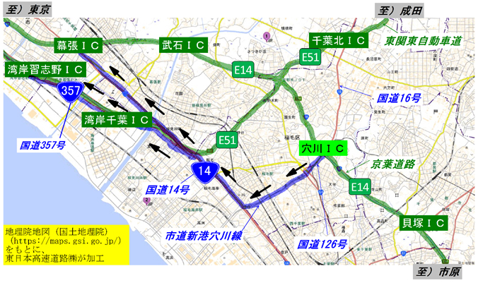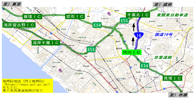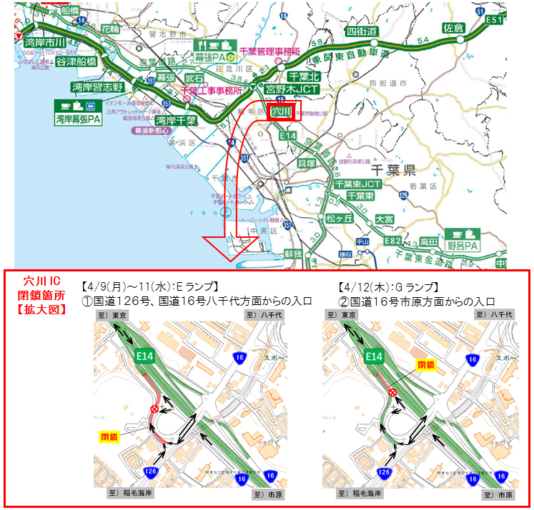 NEXCO東日本 市原管理事務所(千葉県市原市)では、E14京葉道路 穴川(西)インターチェンジ(IC)で、損傷した舗装の補修工事を実施するため、上り線の入口2箇所で夜間閉鎖を行います。