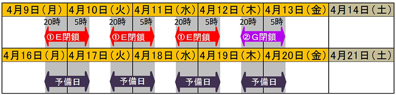 平成30年4月9日(月)~11日(水) 各日夜20時から翌朝5時まで(計3夜間)