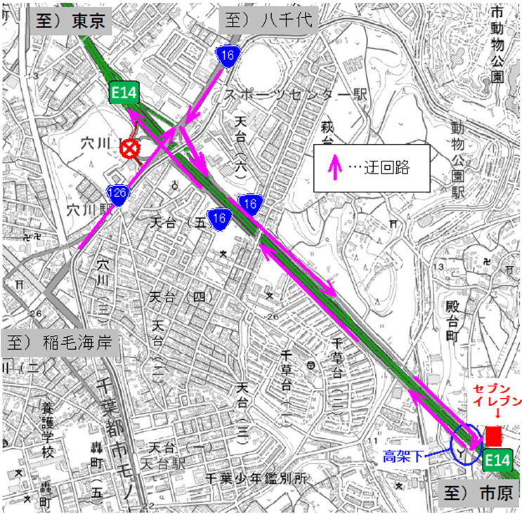 穴川IC上り線入口の閉鎖に伴う迂回路は以下の通りです。