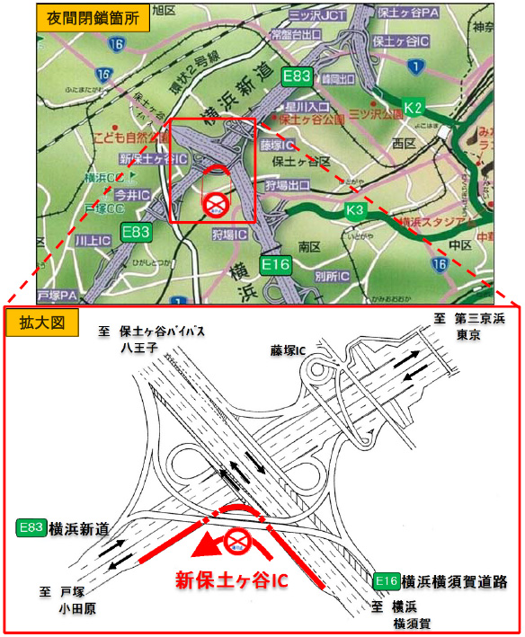 NEXCO東日本 京浜管理事務所(神奈川県横浜市)では、新保土ヶ谷インターチェンジ(以下「IC」)で、舗装補修工事を行うため、E16横浜横須賀道路(以下「横横道」)上り線からE83横浜新道下り線(戸塚・小田原方面)へ向かうランプ車線の夜間閉鎖を行います。