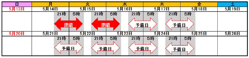 (実施日)平成30年5月14日(月)・15日(火) 各日夜21時~翌朝5時(2夜間)