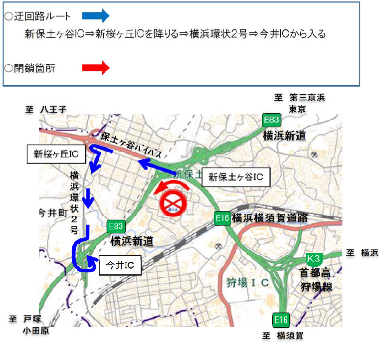 主に国道16号バイパスと横浜環状2号線を迂回路としてご利用ください。