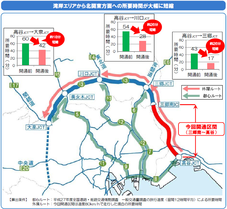 (東関東道から関越道、東北道、常磐道への所要時間が約18分から26分短縮)