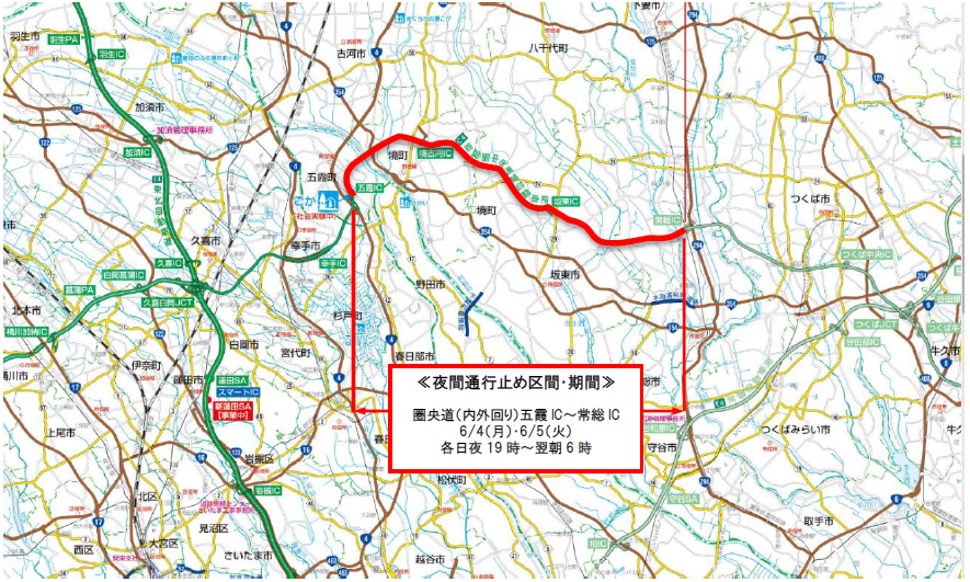 NEXCO東日本 加須管理事務所(埼玉県加須市)は、C4首都圏中央連絡自動車道(以下「圏央道」)五霞インターチェンジ(以下「IC」)~常総IC間で舗装補修工事及び道路構造物の補修・点検を行うため、夜間通行止めを実施します。