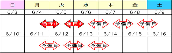 (2)通行止め日時平成30年6月4日(月)・5日(火) 各日夜19時から翌朝6時まで(11時間)