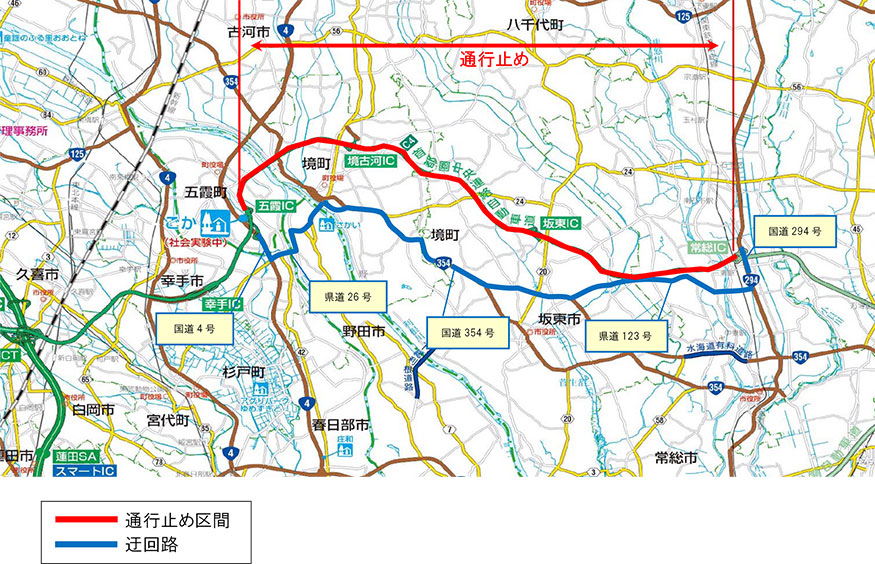 圏央道 五霞IC~常総IC間が通行止めの際の迂回路は、国道4号、国道294号、国道354号、県道26号及び県道123号となります。