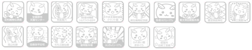 スタンプ設置施設には、それぞれデザインの異なるオリジナルキャラクター「シルクっち」のスタンプを設置しています。スタンプは、以下の全29種類ありますので、是非、たくさんの「シルクっち」を探しに各施設にお越しください。