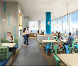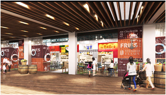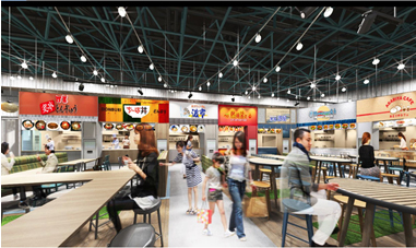 新しいフードコートは、大海原を望む賑やかで活気に溢れる港町をイメージしています。