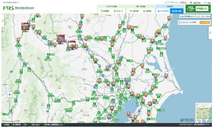 また、気象情報(予報及び実況)、雪道情報をリアルタイムで弊社HP「ドライブトラフィック」により提供するともに、公式Twitterにてエリアごとに高速道路の通行止めやイベント情報をお伝えしていますので、ぜひご覧ください。