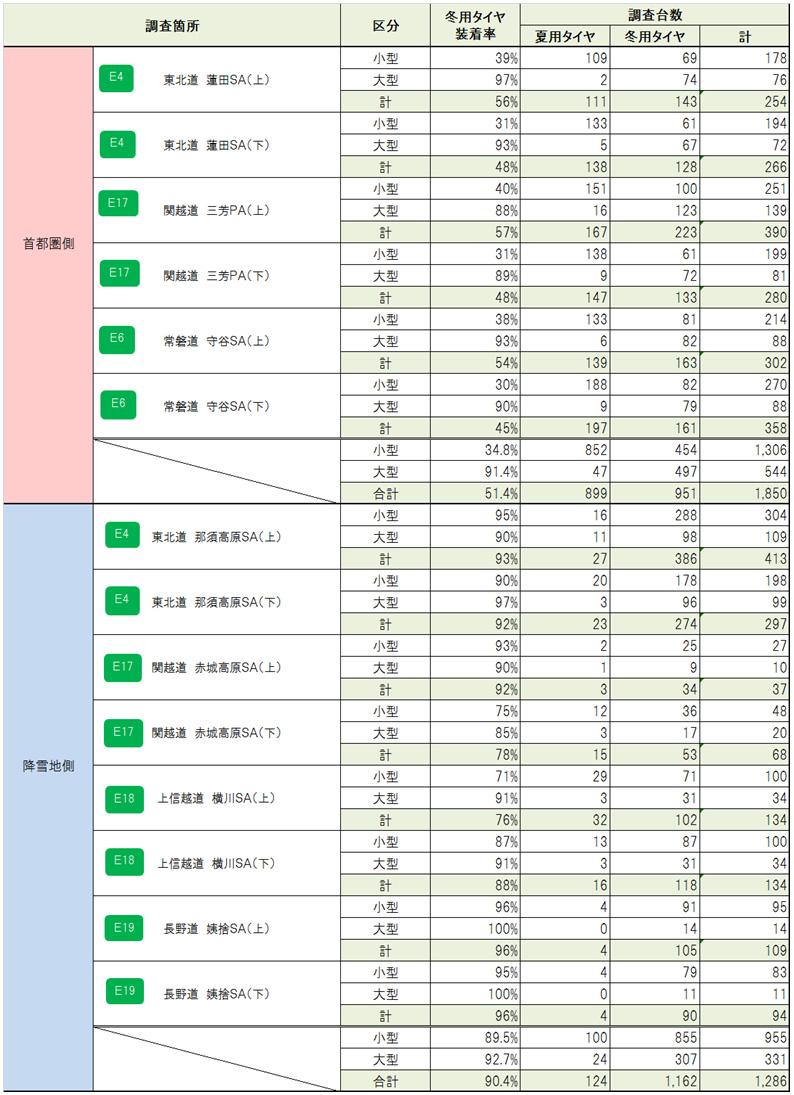 NEXCO東日本関東支社(埼玉県さいたま市)では、雪道運転の安全走行を啓発することを目的として、12月中旬に管内の休憩施設において、冬用タイヤの装着状況調査(第1弾)を実施いたしました。