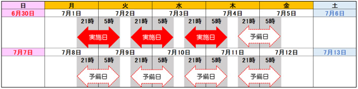 実施日:令和元年7月1日(月)~3日(水) 各日夜21時~翌朝5時
