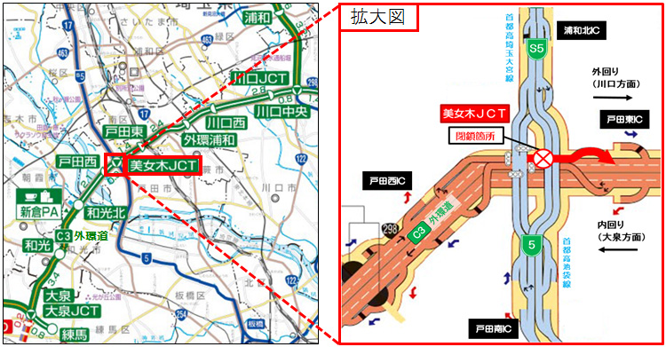 (1)閉鎖箇所:首都高(埼玉大宮線・池袋線)から外環道外回りへ流入する美女木JCTのランプ