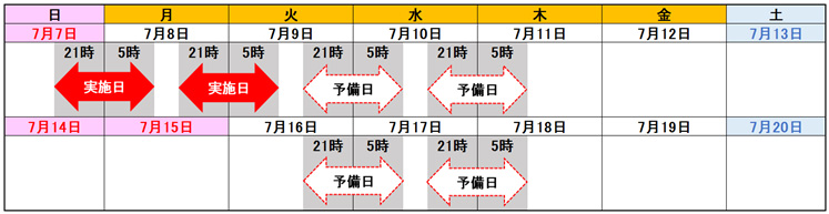 実施日:令和元年7月7日(日)・8日(月) 各日夜21時~翌朝5時