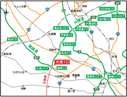 NEXCO東日本 東京外環工事事務所(東京都練馬区)では、東京外かく環状道路の建設に伴い、E17関越自動車道(以下「関越道」)大泉ジャンクション(以下「JCT」)において、橋りょう架設工事を行うため、C3東京外環自動車道(以下「外環道」)大泉インターチェンジ(以下「IC」)の入口および関越道大泉IC入口の夜間閉鎖を実施します。