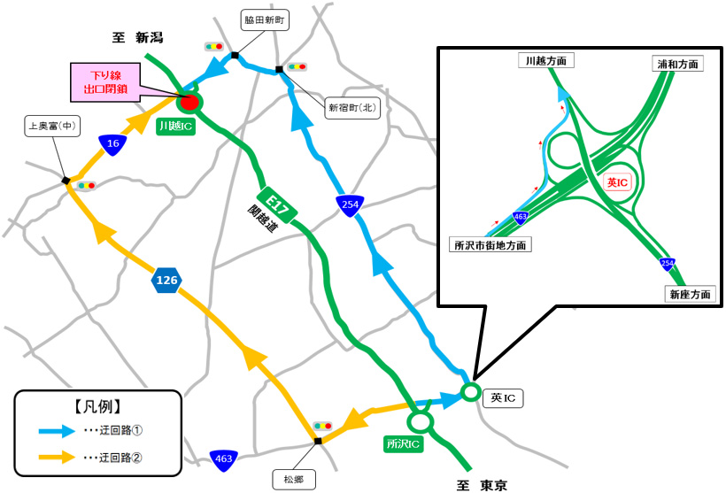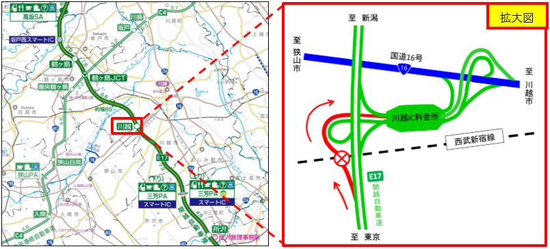 NEXCO東日本 所沢管理事務所(埼玉県所沢市)では、E17関越自動車道(以下「関越道」)川越インターチェンジ(以下「IC」)の出口ランプにて舗装補修工事を行うため、夜間閉鎖を実施します。