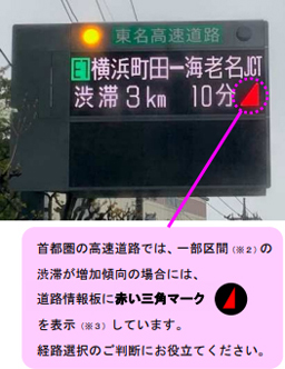 E1東名(東京IC~豊川IC)、E1A新東名(厚木南IC~伊勢原JCT、御殿場JCT~三ヶ日JCT)、E4東北道(川口JCT~矢板IC)、E6常磐道(三郷JCT~日立南太田IC)、E17関越道(練馬IC~昭和IC)、E50北関東道(高崎JCT~太田藪塚IC、太田桐生IC~岩舟JCT、栃木都賀JCT~宇都宮上三川IC、笠間西IC~水戸南IC)、E51東関東道(起点~成田IC)、E52中部横断道(新清水JCT~富沢IC)、E65新空港道、E14京葉道路・館山道・富津館山道(鋸南富山IC~富浦ICを除く)、C3外環道、C4圏央道(あきる野IC~大栄JCT)、CA東京湾アクアライン・アクアライン連絡道 - 3:一部の情報板では赤い三角マークを表示できないものもあります。