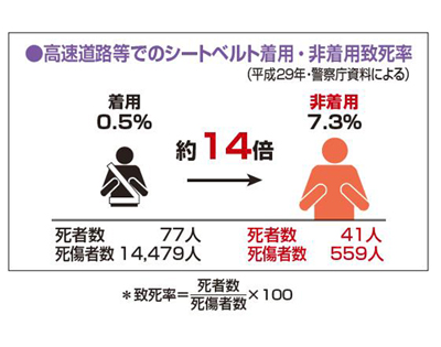 関東支社管内の高速道路でシートベルトの非着用により車外に放出されて、死亡する悲惨な事故が発生しております。過去のデータでは、シートベルト非着用者の致死率は着用者の約14倍にも及びます(下図)。また、警察庁とJAF による調査では、高速道路等における着用率は、運転者が99.5%※なのに対し、後部座席同乗者は74.4%※に留まっています(※2017年シートベルト着用率データより)。シートベルトは命に直結するものですので、運転席・助手席・ 後部座席すべての座席で必ず着用しましょう。