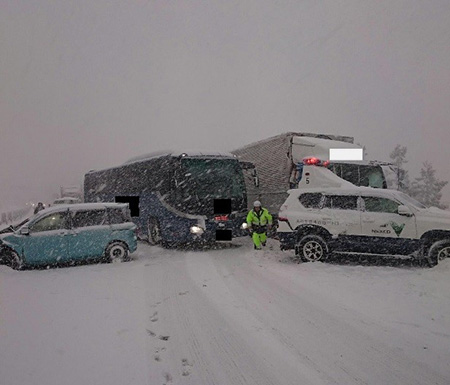 冬の高速道路では、車間距離を十分にとってスピードを控えめに、「急ハンドル」、「急加速」、「急ブレーキ」などの「急」の付く操作は行わず、ゆっくりと安全な運転をお願いします。