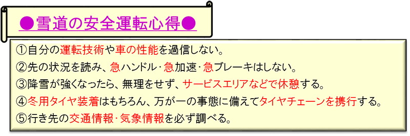 また、冬期においては、出発地は晴れていても目的地や通過点で雪が降っていることもありますので、出発前に気象情報を予め調べたうえで安全な備えをお願いします。