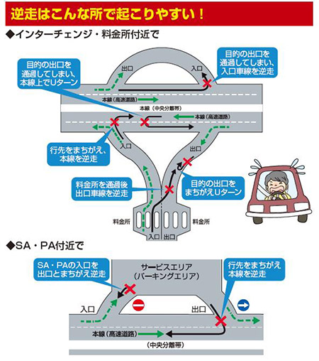 高速道路上で、逆走車に起因する重大事故が発生しています。高速道路は指定された方向にしか進めません。規制標識や案内標識、路面標示を十分に確認しましょう。