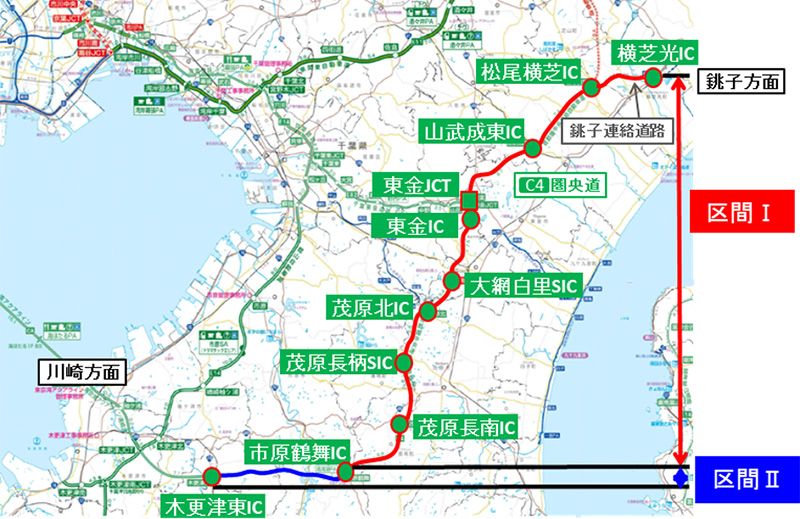 NEXCO東日本 市原管理事務所(千葉県市原市)及び東京湾アクアライン管理事務所(千葉県木更津市)では、C4首都圏中央連絡自動車道(以下「圏央道」)松尾横芝インターチェンジ(以下「IC」)から木更津東IC間にて、舗装補修工事及び道路構造物の補修・点検を行うため、夜間通行止めを実施します。