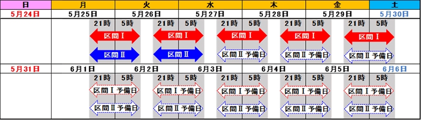 予備日:令和2年5月27日(水)~6月5日(金)(土日除く) 各日夜21時から翌朝5時まで