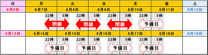 6月7日(月)~6月9日(水) 各日夜22時から翌朝5時まで