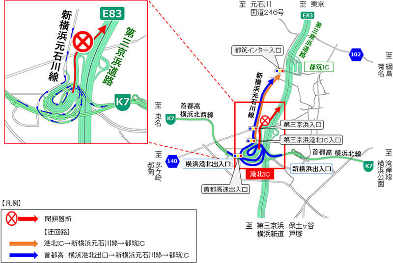 NEXCO東日本 京浜管理事務所(神奈川県横浜市)では、E83第三京浜道路(以下「第三京浜」) 上り線 港北(こうほく)インターチェンジ(以下「IC」)の入口ランプにて舗装補修工事を行うため、夜間閉鎖を実施します。