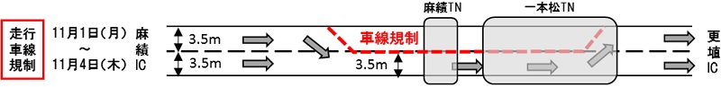 - 規制区間走行する際は規制速度を遵守のうえ、車間距離を確保し追突事故などに十分にご注意ください。また、規制区間の前後で案内看板に従って早めの車線変更をお願いします。