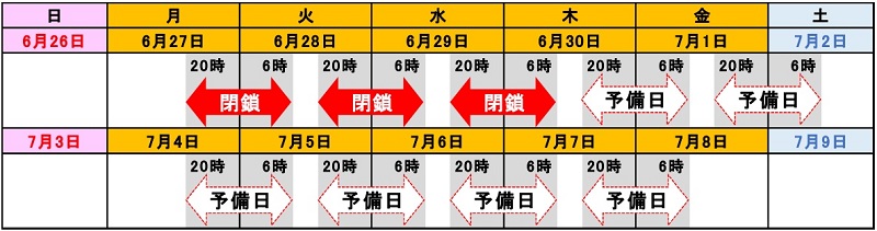 実施日:令和4年6月27日(月)~29日(水)各日夜20時~翌朝6時予備日:令和4年6月30日(木)~7月7日(木)【土日除く】各日夜20時~翌朝6時
