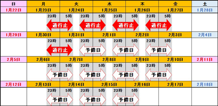 実施日:令和5年1月23日(月)~26日(木)、30日(月)各日夜23時~翌朝5時予備日:令和5年1月31日(火)~2月2日(木)各日夜23時~翌朝5時令和5年2月6日(月)~9日(木)各日夜23時~翌朝5時令和5年2月13日(月)~15日(水)各日夜23時~翌朝5時