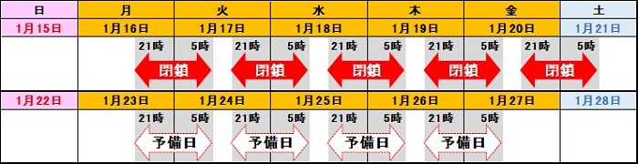 実施日:令和5年1月16日(月)~20日(金)各日夜21時~翌朝5時予備日:令和5年1月23日(月)~26日(木)各日夜21時~翌朝5時