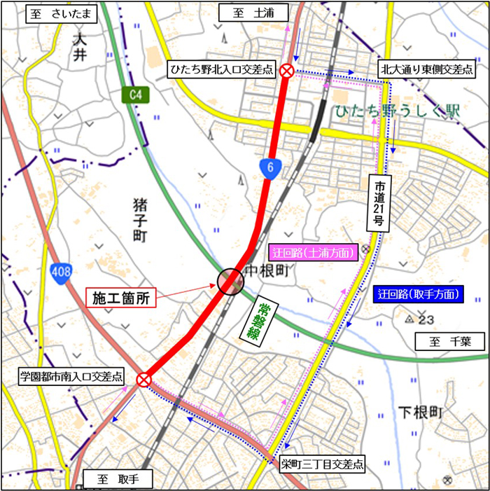 NEXCO東日本 つくば工事事務所(茨城県つくば市)は、牛久市内の国道6号において、C4首都圏中央連絡自動車道(以下「圏央道」)4車線化事業として国道6号と交差する高架橋の橋りょう一括架設工事を行うため、夜間通行止めを実施します。