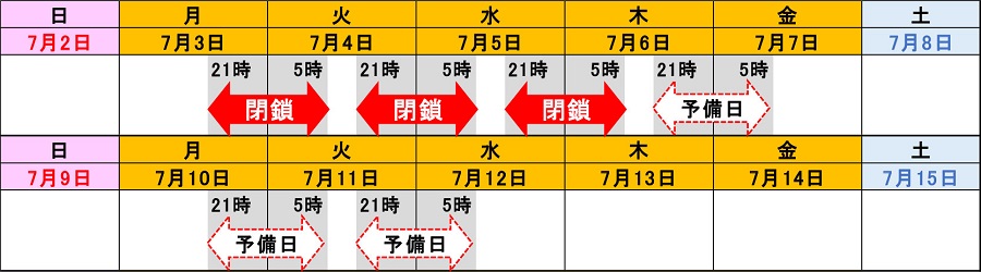 7月3日(月)~5日(水) 各日夜21時から翌朝5時まで