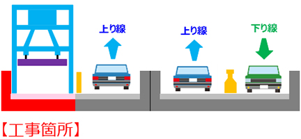 - 走行車線や路肩が狭くなっているため、走行する際は規制速度を遵守し、車間距離を確保して追突事故などには十分注意をお願いします。また、規制区間の前後では大きく車線が切り替わりますので、現地の案内看板などに従って通行をお願いします。