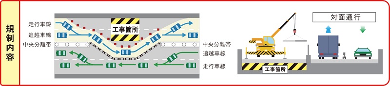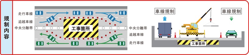 - 走行車線や路肩が狭くなっているため、通行する際は規制速度を遵守し、車間距離を確保して追突事故などには十分注意をお願いします。また、規制区間の前後では大きく車線が切り替わりますので、現地の案内看板などに従って通行をお願いします。